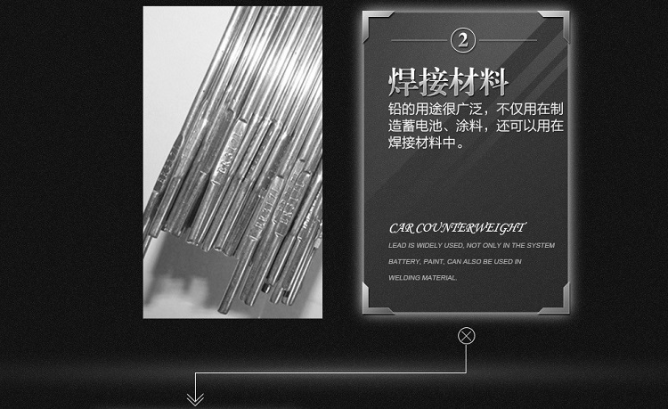 主要用途:主要應(yīng)用在制造蓄電池、涂料、彈頭、焊接材料、化學(xué)品鉛鹽、電纜護(hù)套、軸承材料、嵌縫材料、巴氏合金和X射線的防護(hù)材料等。